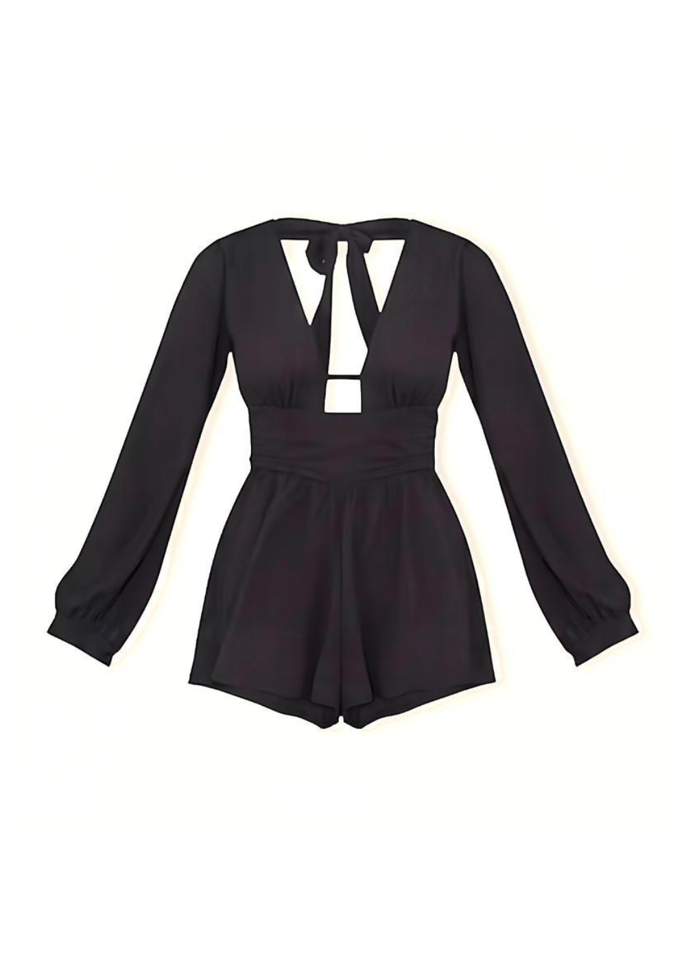 Black Long Sleeve Tie-Back V-Neck Playsuit